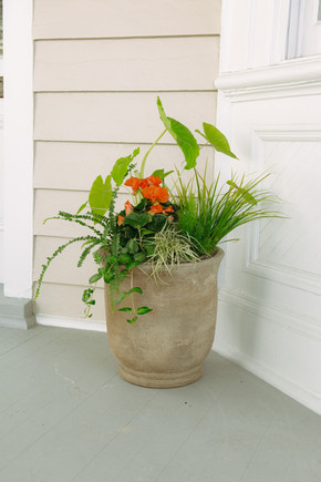 Once you've considered all your factors, it's time to choose plants. You want to choose plants that follow this pattern: thriller, filler, spiller. This isn’t a new saying, but you may not know what it means. “Thriller” refers to the largest, eye-catching plant in your container. In large pots you can even have more than one thriller! Common thrillers include: palms, grasses, cordyline, salvia, iris, elephant ears, and many more options. In a 360 degree container, these plants would be planted in the center, but if your container has a back, that’s where these plants should live. Next, your “filler” plants are all the medium height plants that literally fill in the empty space below your thriller. You want to vary the texture, color, and height of plants in this category. The more variety you bring to your container, the more professional it will look! However, you can always pick two plants to repeat in a pattern if that is more your style. We love using ferns, plectranthus, carex, coleus, heuchera, and any seasonal flowers as fillers. Finally, your “spiller” plants will bring the eye down your design to the pot. These plants hang or spill over the sides of the pot, elongating the container design. Choose plants that have a creeping growth habit like: sweet potato vine, lysimachia, vinca vine, lamium, and creeping jenny.